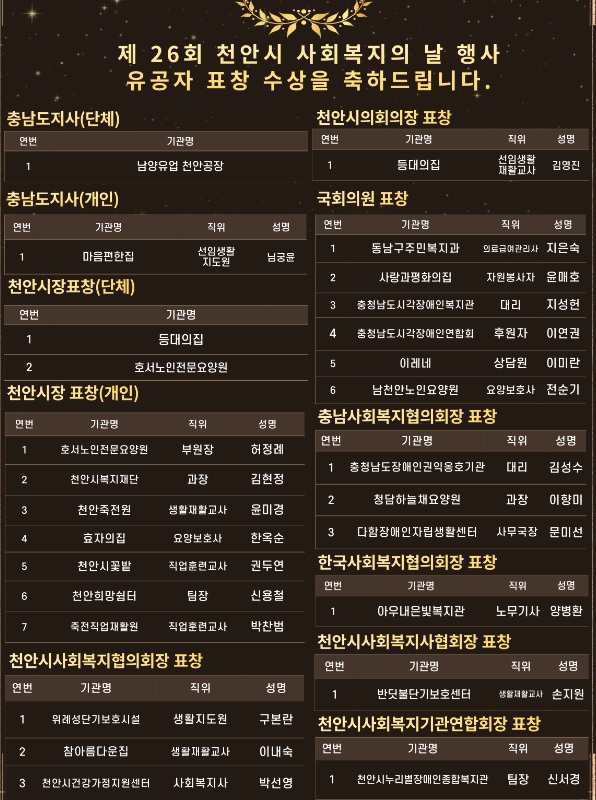 제 26회 천안시사회복지의 날 행사 유공자 표창수상 페이지 정보 작성자작성자 : 천사협 조회조회수 : 910회 작성일작성일 : 25-09-23 13:14 본문 수상을 축하 드립니다! 목록 다음글「제26회 천안시사회복지의 날 행사」사회복지 유공자 추천 협조 요청 25.07.28